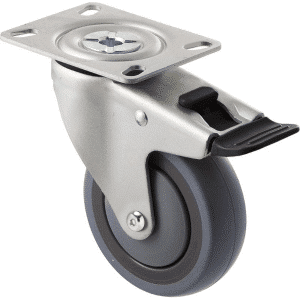 M Series castor, energy absorbent, 100mm grey rubber wheel (tall profile), precision bearing, swivel plate, total brake, 100 kg load rating
