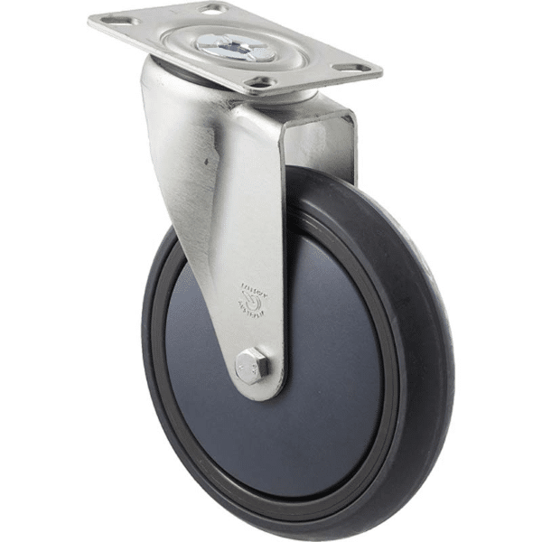 M Series castor, energy absorbent grey rubber, precision bearing, swivel North American (NA) plate, black seal & pedal 150mm 200 kg load