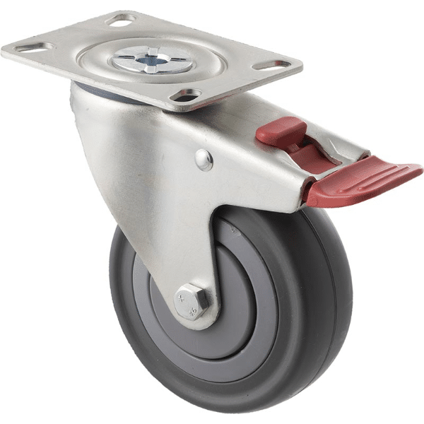 M Series castor, 100mm energy absorbent grey rubber wheel (low-profile tyre), plain bearing, swivel plate, total brake, load rating 140 kg