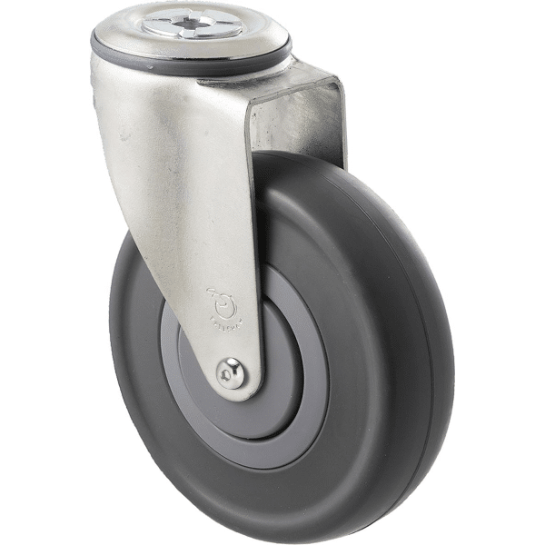 M Series castor, 125mm energy absorbent grey rubber wheel (low-profile tyre), precision bearing, thread guard, swivel bolt hole, Chicago screw axle, 150 kg load