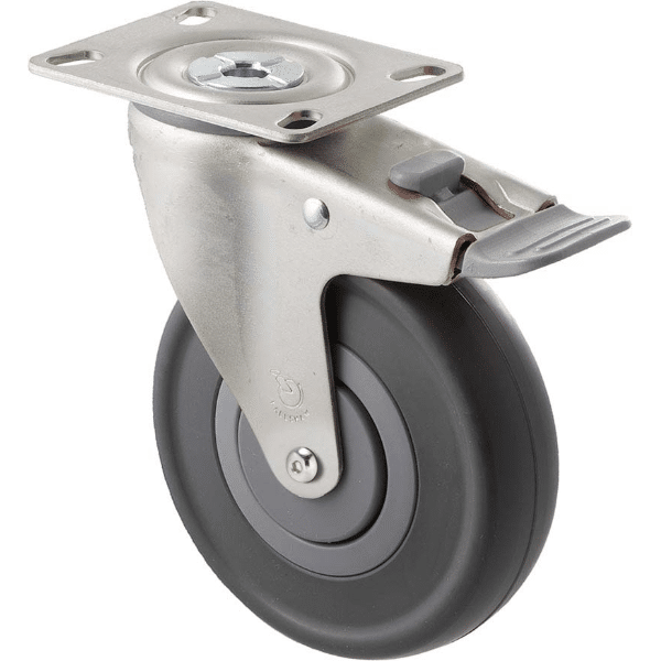 M Series castor, 125mm energy absorbent grey rubber wheel (low-profile tyre), precision bearing, thread guard, swivel plate, total brake, grey seal & pedal, Chicago screw axle, 150 kg load