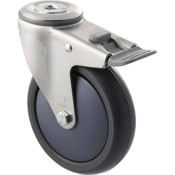 M Series castor, antistatic/conductive 125mm x 32mm TPE rubber wheel, thread guard, swivel bolt hole, total brake, zinc fork, grey seal & pedal, precision bearing, 85 kg load rating