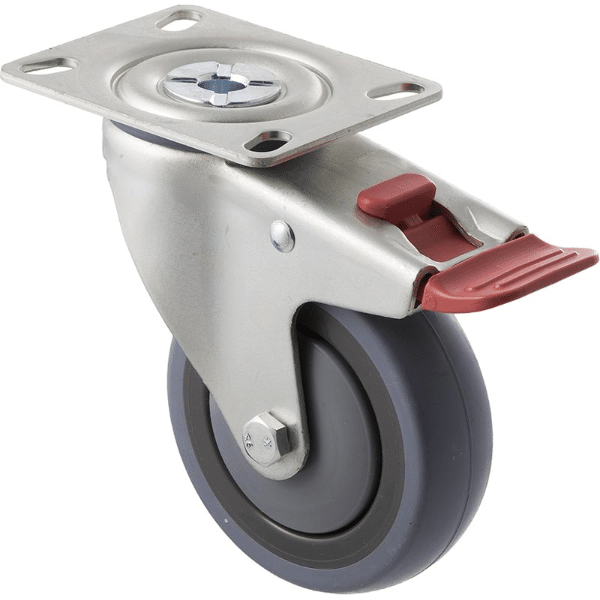 The STQ100G/MZPNTB Castor has a Grey rubber wheel with a diameter of 100Â mm, and a maximum load capacity of 100Â kg per Castor.