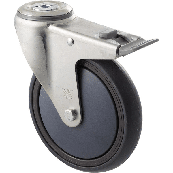 M Series castor, energy absorbent, 150mm grey rubber wheel, plain bearing, swivel bolt hole, total brake, grey seal & pedal, 200 kg load