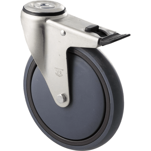 M Series castor, energy absorbent, 175mm grey rubber wheel, plain bearing, swivel bolt hole, total brake, black seal & pedal, 200 kg load