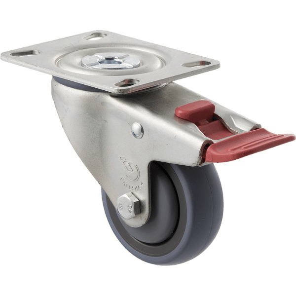 M Series castor, energy absorbent, 75mm grey rubber wheel (tall profile), precision bearing, swivel plate, total brake, 100 kg load rating