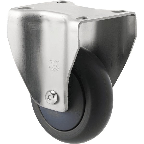 The MJQ100G/MZFNC Castor has a Thermoplastic elastomer (TPE) wheel with a diameter of 100Â mm, and a maximum load capacity of 85Â kg per Castor.