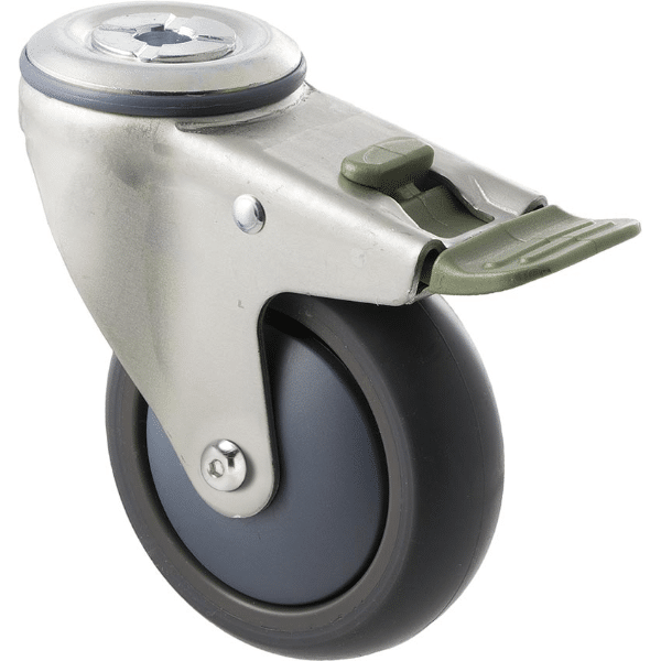 The MJQ100G/MZHDLC Castor has a Thermoplastic elastomer (TPE) wheel with a diameter of 100Â mm, and a maximum load capacity of 85Â kg per Castor.