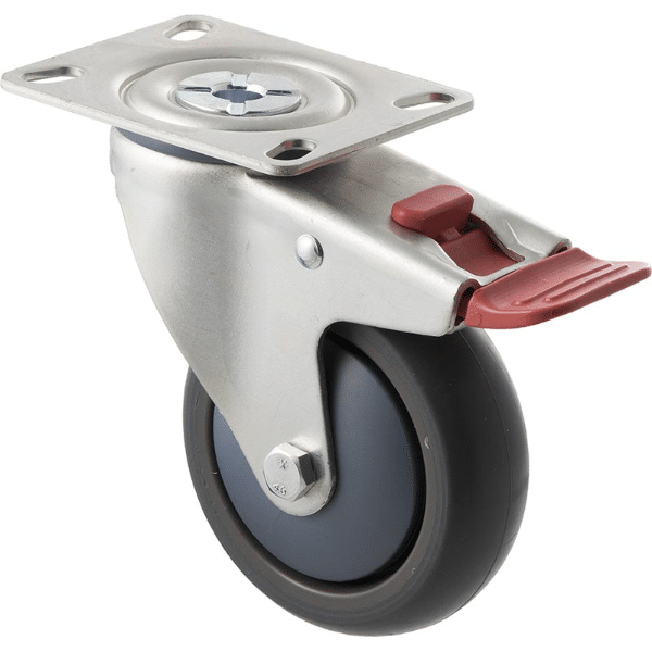 M Series castor, thermoplastic elastomer (TPE) 100mm wheel, precision bearing, swivel North American (NA) plate, total brake, Bluestone thread guard, load rating 85 kg