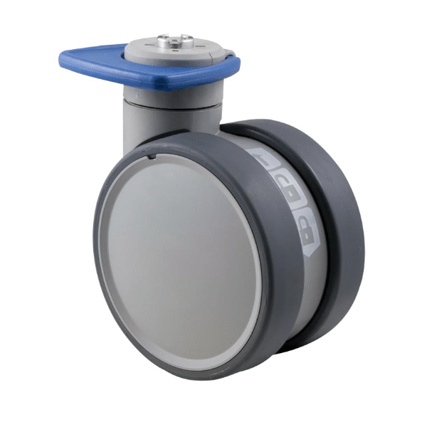 Trinity medical castor, 125mm polyurethane (PU) wheel, 90 degree pedal, total brake, coolgrey, standard fork, 125 kg load rating