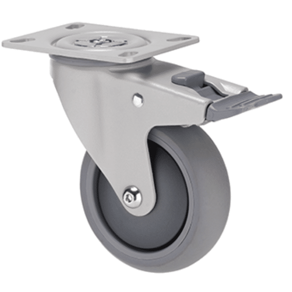 The MJQ100G/MPPTBGH Castor has a Thermoplastic elastomer (TPE) wheel with a diameter of 100Â mm, and a maximum load capacity of 85Â kg per Castor.
