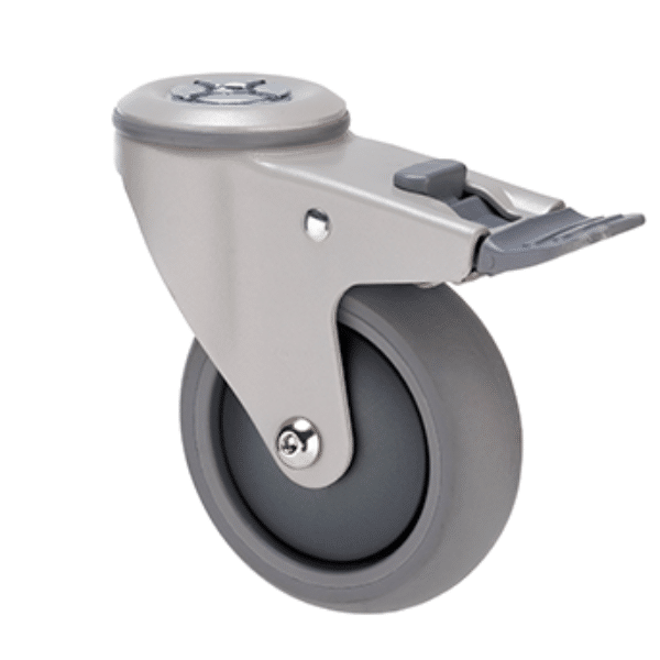 The MJQ100G/MPHTBGH Castor has a Thermoplastic elastomer (TPE) wheel with a diameter of 100Â mm, and a maximum load capacity of 85Â kg per Castor.