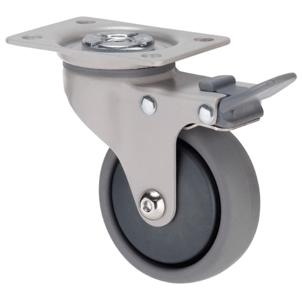 K Series castor, 75mm x 28mm TPE rubber wheel, thread guard, swivel plate, brake, silverpowder-coat, 50 kg load rating