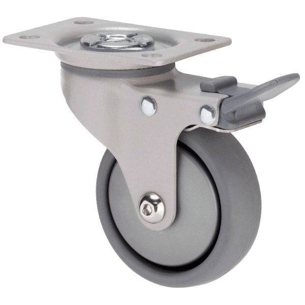 K Series castor, 75mm x 28mm TPE rubber wheel, thread guard, swivel plate, brake, silverpowder-coat, 50 kg load rating