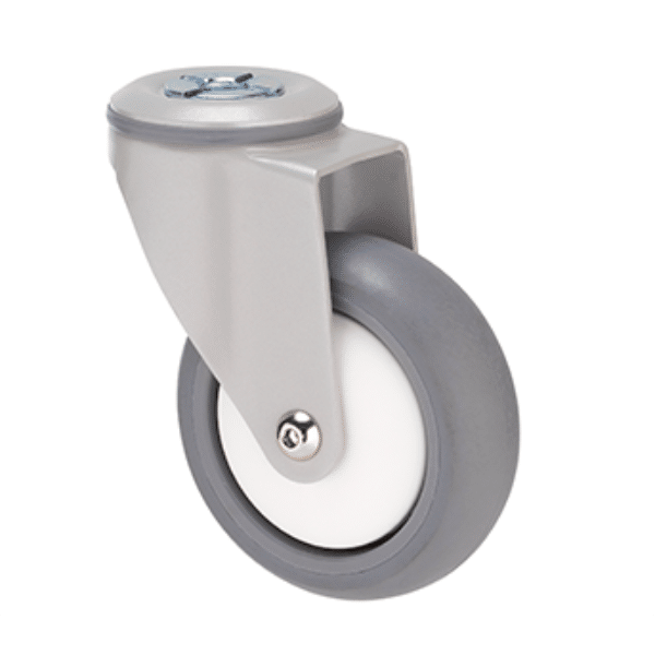 M Series castor, thermoplastic elastomer (TPE) 100mm wheel, plain bearing, swivel bolt hole (powder-coated), white thread guard, load rating 85 kg