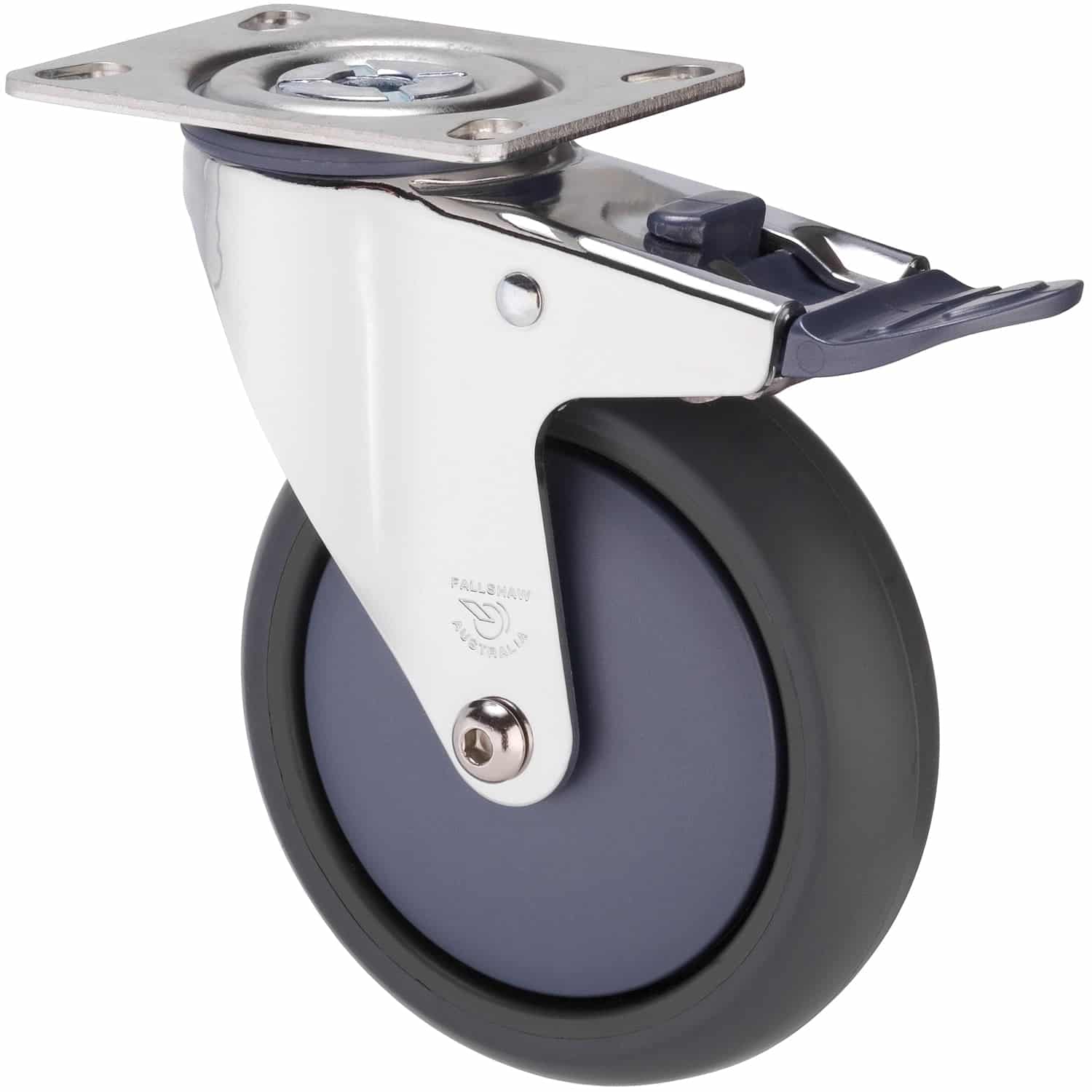 M Deluxe decorative chrome- plated castor,Thermoplastic elastomer (TPE) 125mm wheel, precision bearing, swivel plate, total brake, Bluestone thread guard, load rating 85 kg